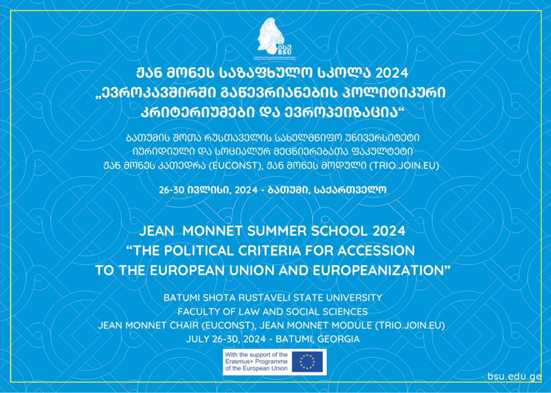 Batumi Shota Rustaveli State University invites students of the undergraduate educational programs to participate in the Summer School: "The Political Criteria for Accession to the EU and Europeanization". The Summer school is organized within the Jean Monnet Module "Political Criteria for Accession to the European Union and Europeanization of Georgia, Moldova, and Ukraine" funded by European Commission in the framework of Erasmus+ Programme of the European Union. The Jean Monnet Module aims to promote excellence in teaching and research in the field of European Union studies, particularly on the legal-political bases of the accession process to the European Union and Europeanization of Georgia, Moldova, and Ukraine. The Summer School will address the following possible topics: