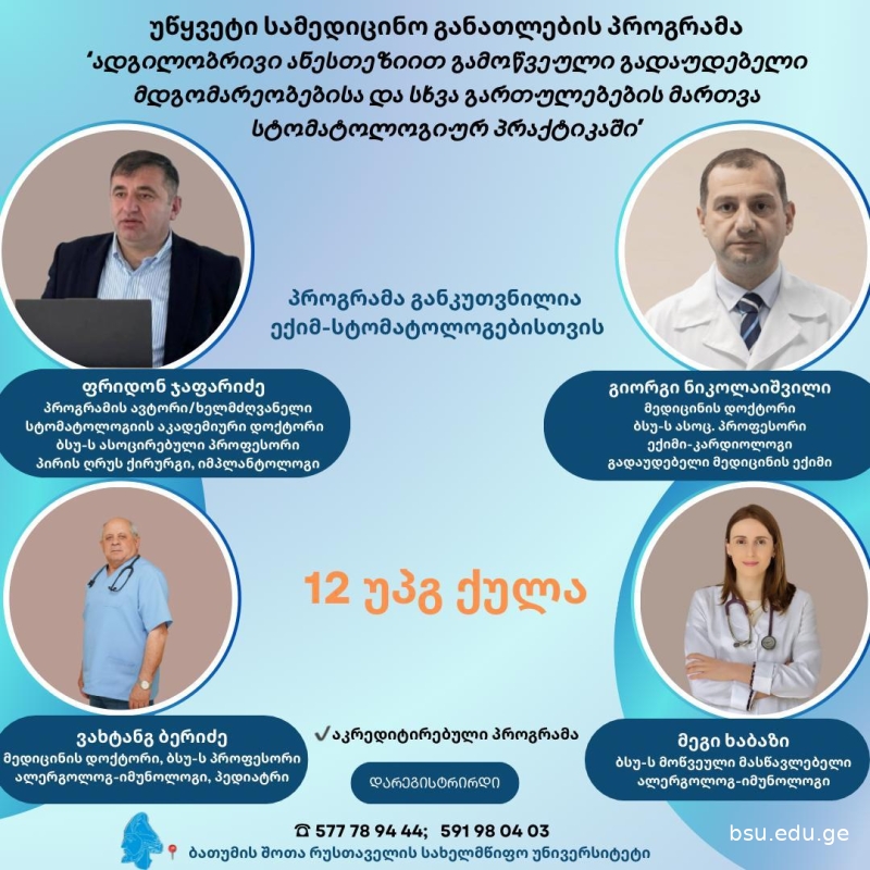 ბათუმის შოთა რუსთაველის სახელმწიფო უნივერსიტეტი აცხადებს კონკურსს მედიცინის საგანმანათლებლო პროგრამის მე-5 და მე-6 სასწავლო წლის სტუდენტებისთვის თბილისში, შპს „ტოტალ-შარმ“-ის კლინიკაში 2025 წლის 20 სექტემბერს კადავერ კურსებში მონაწილეობის მიზნით.