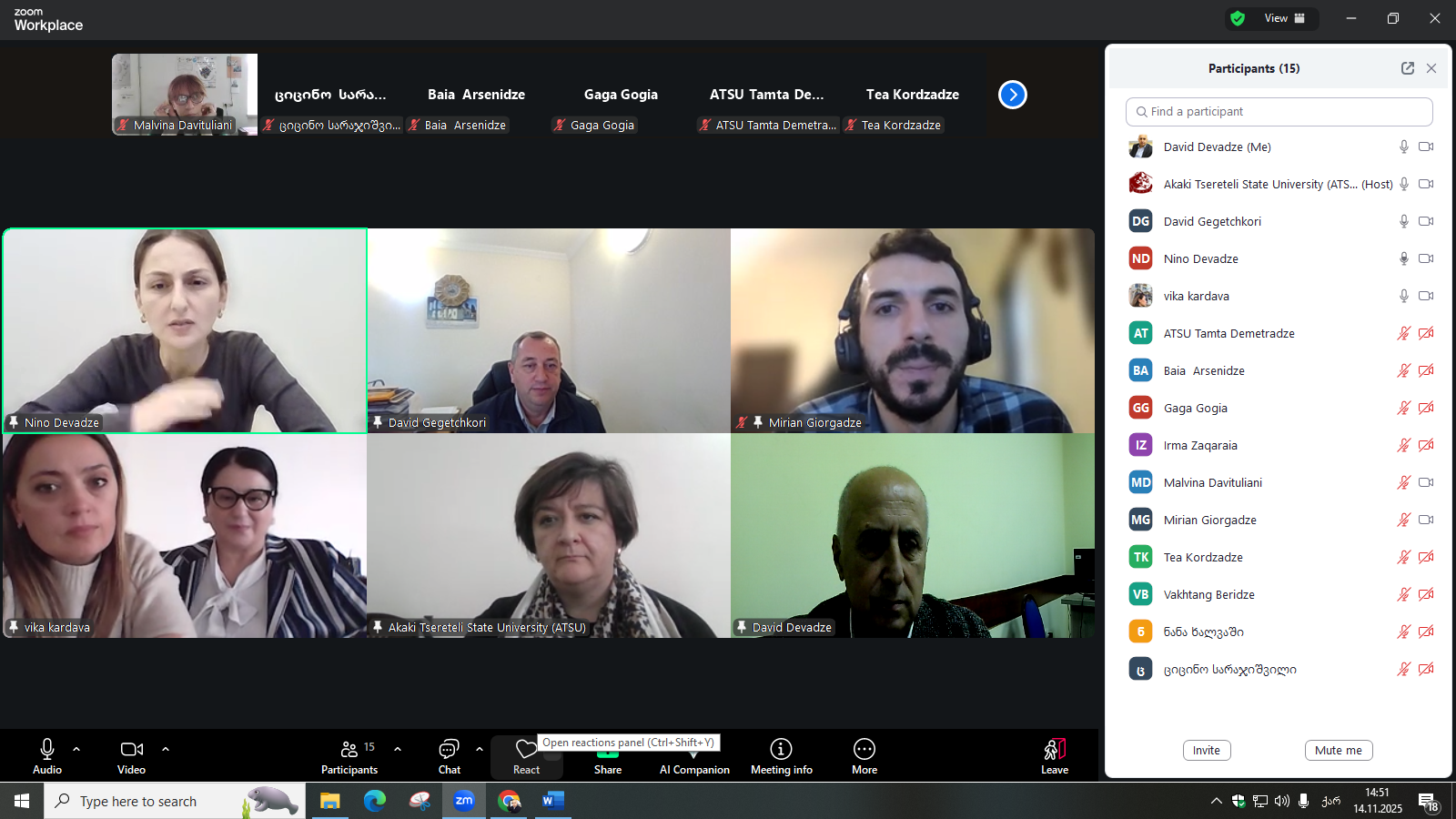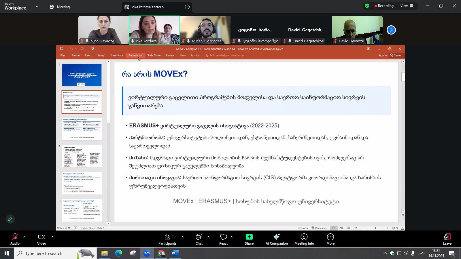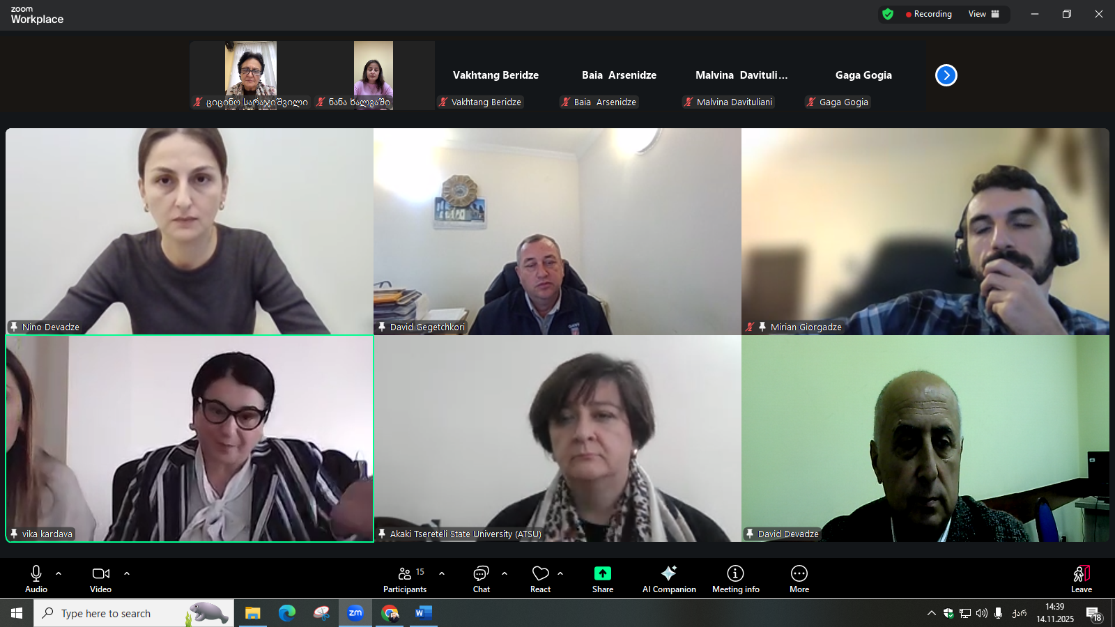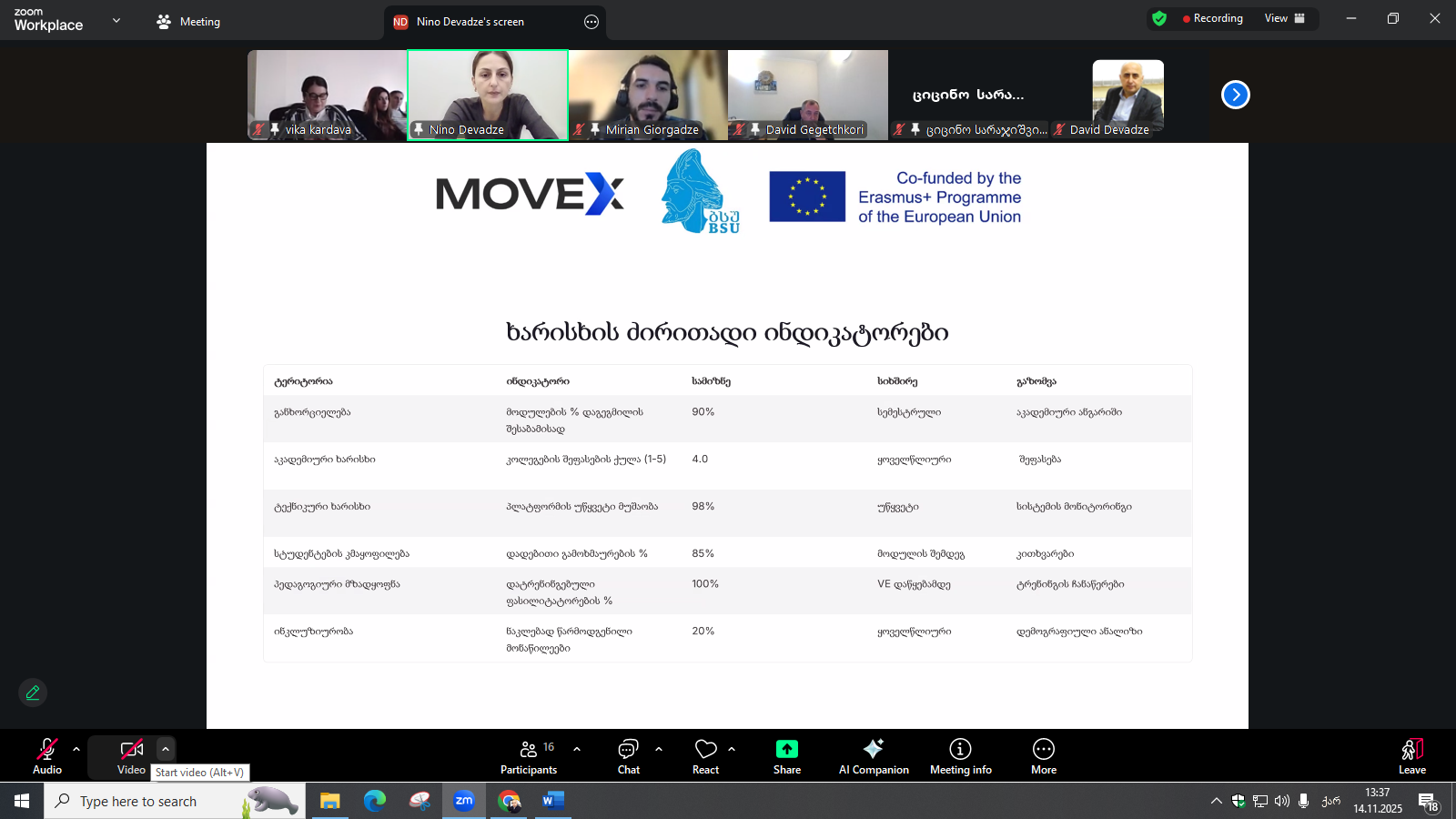 მიმდინარე წლის 14 ნოემბერს Zooom-ის პლატფორმაზე, ერასმუს+ „(MOVEx) ვირტუალური გაცვლითი პროგრამების მოდელისა და ერთიანი საინფორმაციო სივრცის შექმნა“ პროექტის ფარგლებში, გაიმართა პროექტის პარტნიორი ქართული უნივერსიტეტების მიერ ორგანიზებული სამუშაო შეხვედრა ადმინისტრაციული პერსონალისთვის.
