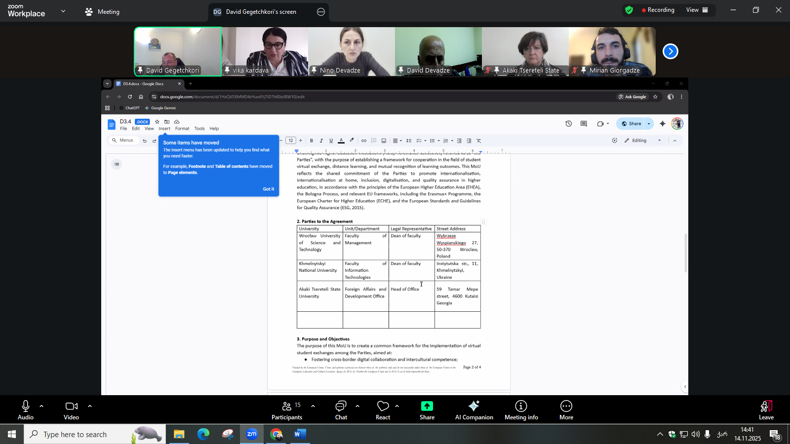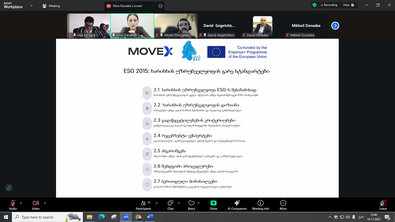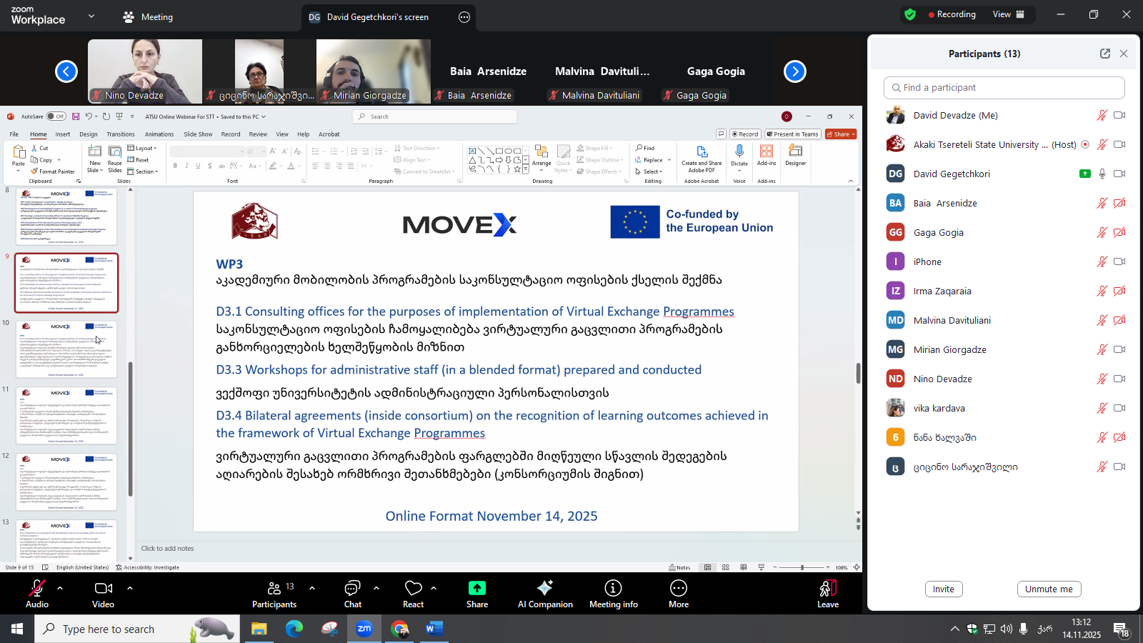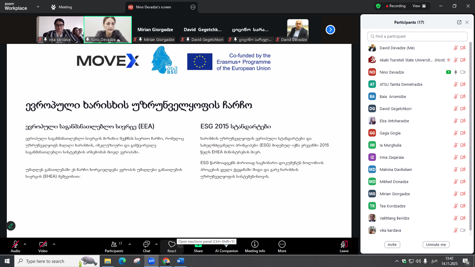 მიმდინარე წლის 14 ნოემბერს Zooom-ის პლატფორმაზე, ერასმუს+ „(MOVEx) ვირტუალური გაცვლითი პროგრამების მოდელისა და ერთიანი საინფორმაციო სივრცის შექმნა“ პროექტის ფარგლებში, გაიმართა პროექტის პარტნიორი ქართული უნივერსიტეტების მიერ ორგანიზებული სამუშაო შეხვედრა ადმინისტრაციული პერსონალისთვის.