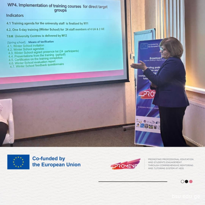 „ERASMUS+”-ის საგრანტო პროექტის „პროფესიული განათლებისა და სტუდენტების ჩართულობის ხელშეწყობა მენტორინგისა და ტუტორინგის სისტემით უმაღლეს საგანმანათლებლო დაწესებულებებში" პროექტის მენეჯერი, ზუსტ მეცნიერებათა და განათლების ფაკულტეტის დეკანი, პროფესორი ლელა თურმანიძე და მკვლევარი ელისო ძნელაძე, მოწვეული მასწავლებელი, ტექნიკის მეცნიერებათა დოქტორი, აკადემიური საბჭოს სამდივნოს უფროსი, 2025 წლის 17 თებერვლიდან 23 თებერვლის ჩათვლით იმყოფებოდნენ უჟგოროდში (უკრაინა), პროექტის ფარგლებში დაგეგმილ ვორქშოფსა და საკოორდინაციო შეხვედრაზე.