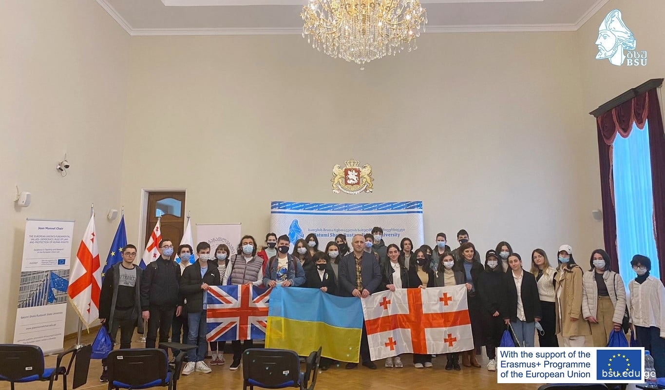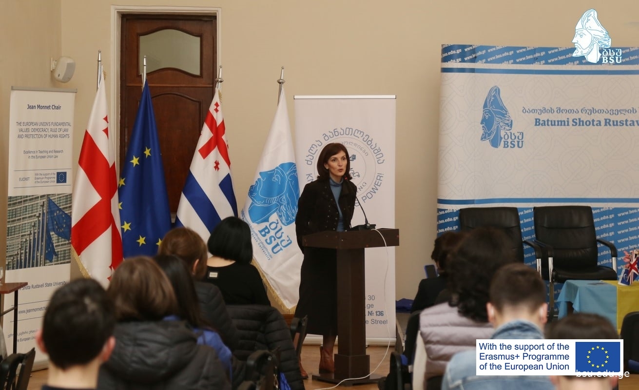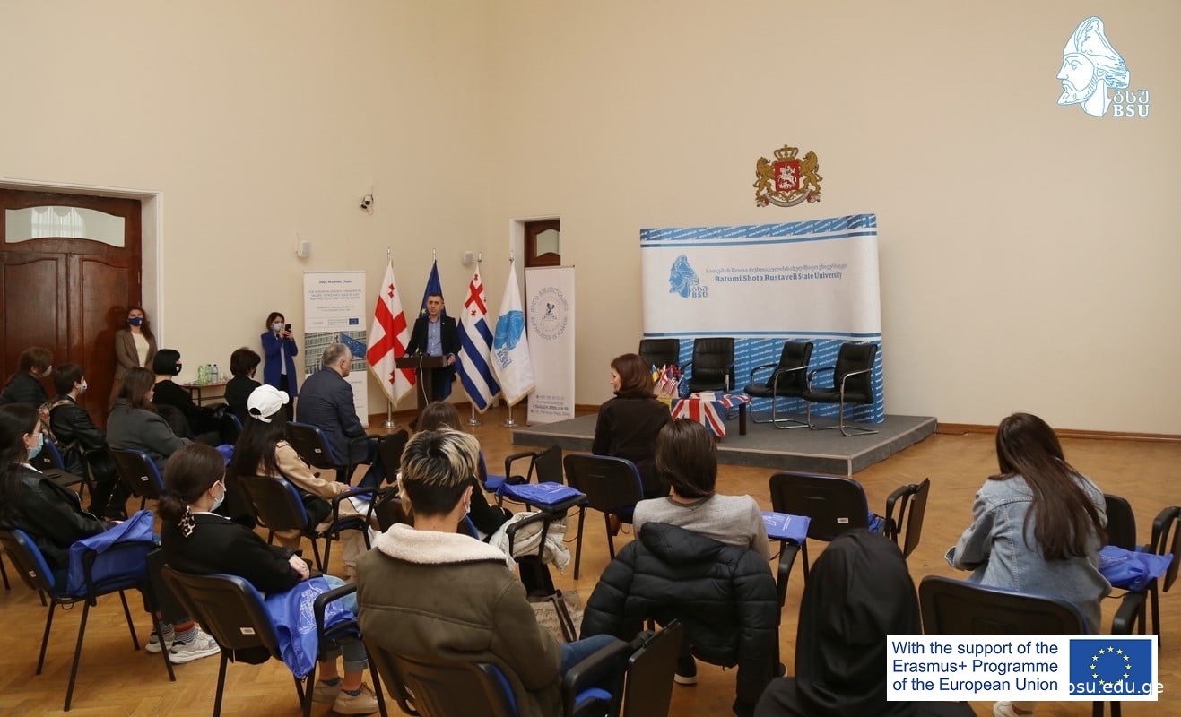 ბათუმის შოთა რუსთაველის სახელმწიფო უნივერსიტეტში ჩატარდა საჯარო ლექცია და დისკუსია თემაზე: „ევროკავშირის ძირითადი ღირებულებები და გაწევრიანების პროცედურა“. ღონისძიება გახსნა ბათუმის შოთა რუსთაველის სახელმწიფო უნივერსიტეტის რექტორმა, პროფესორმა მერაბ ხალვაშმა. შეხვედრა ორგანიზებული იყო ბსუ-ს ჟან მონეს კათედრის მიერ ინგლისური ენის სასწავლო ცენტრ Eti Holding-თან თანამშრომლობით საჯარო სკოლის მოსწავლეებისთვის. ღონისძიებაში მონაწილეობა მიიღეს საჯარო სკოლის 40-მდე მოსწავლემ და მასწავლებლებმა. ჟან მონეს კათედრის ხელმძღვანელმა, პროფესორმა მალხაზ ნაკაშიძემ ისაუბრა ევროკავშირის ძირითადი ღირებულებების, ასევე ევროკავშირში გაწევრიანების პროცედურის შესახებ.