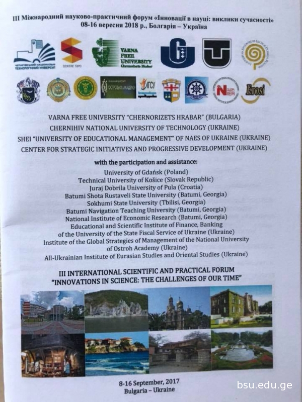 ბსუ-ს პროფესორებმა მონაწილეობა მიიღეს 8-15 სექტემბერს, ვარნის თავისუფალ უნივერსიტეტში გამართულ III საერთაშორისო სამეცნიერო-პრაქტიკული ფორუმში „ინოვაციები მეცნიერებაში: თანამედროვეობის გამოწვევები“. პროფესორებმა ნათია წიკლაშვილმა, ასიე ცინცაძემ, ანზორ დევაძემ, ასოცირებულმა პროფესორებმა ბადრი გეჩბაიამ, გულიკო და დათო ქათამაძეებმა, ირმა ჩხაიძემ, პაატა ჩაგანავამ, ია მესხიძემ, ნანი გვარიშვილმა, ასისტენტ პროფესორებმა ლილით მელოიანმა, ნატო ჯაბნიძემ, ნატალია რობიტაშვილმა, ირინა თავაძემ, ნარგიზ ფალავანდიშვილმა, ირინა ვაშაყმაძემ, ლეილა ცეცხლაძემ, დოქტორმა ნუგზარ ზოსიძემ მოხსენებები წარმოადგინეს დარგის აქტუალურ საკითხებზე. ფორუმის ფარგლებში შედგა საქმიანი შეხვედრები ქ. ვარნას მუნიციპალიტეტის მერიის უმაღლესი განათლების განყოფილების, ვარნის თავისუფალი უნივერსიტეტის ადმინისტრაციის წარმომადგენლებთან და მოეწყო მრგვალი მაგიდა ბულგარეთის საგანმანათლებლო სისტემის შესახებ.