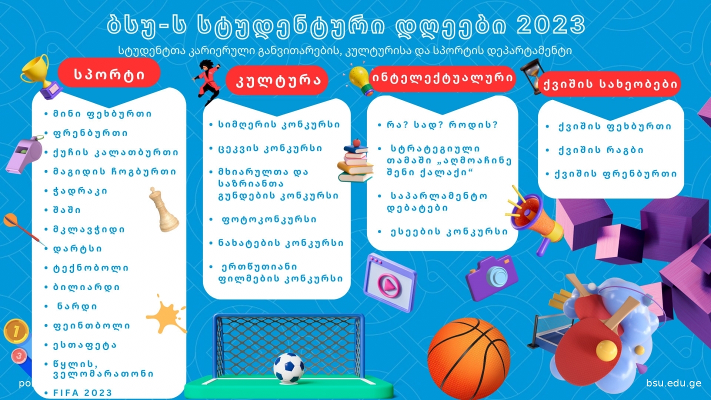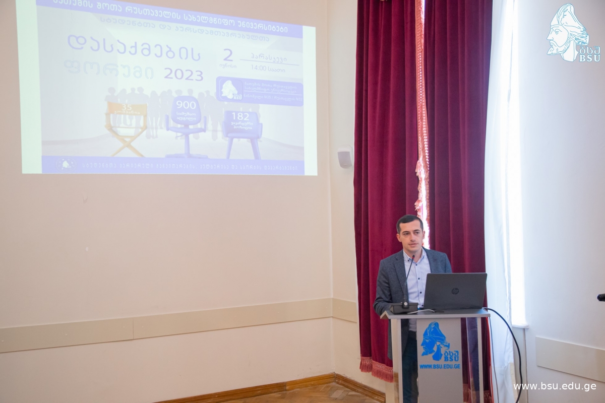 ბსუ-ს სტუდენტთა კარიერული განვითარების, კულტურისა და სპორტის დეპარტამენტის ორგანიზებით, სტუდენტთა და კურსდამთავრებულთა დასაქმების მასშტაბური ფორუმი გაიმართა. ფორუმი გახსნეს და სტუდენტთა დასაქმების ხელშეწყობის მნიშვნელობაზე ისაუბრეს ბსუ-ს რექტორმა მერაბ ხალვაშმა და სტუდენტთა კარიერული განვითარების, კულტურისა და სპორტის დეპარტამენტის უფროსმა ლევან ტარიელაძემ.