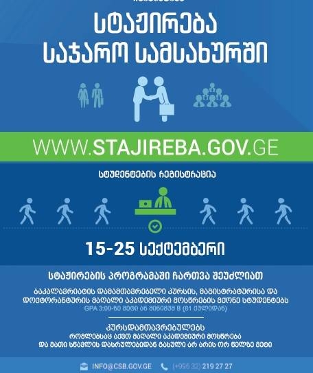 საჯარო სამსახურის ბიურო საუკეთესო შესაძლებლობას გაძლევთ, სტაჟირება გაიაროთ საჯარო დაწესებულებებში დამამთავრებელი კურსის სტუდენტებსა და კურსდამთავრებულებს (რომელთა სწავლის დასრულებიდან გასული არ არის ორ წელზე მეტი), რომლებიც გამოირჩევით/გამოირჩეოდით მაღალი აკადემიური მოსწრებით (GPA მინიმუმ 3.0). სტაჟირების მსურველები, აუცილებელია დარეგისტრირდეთ ვებგვერდზე - www.stajireba.gov.ge, მიმდინარე წლის 15-დან 25 სექტემბრამდე.