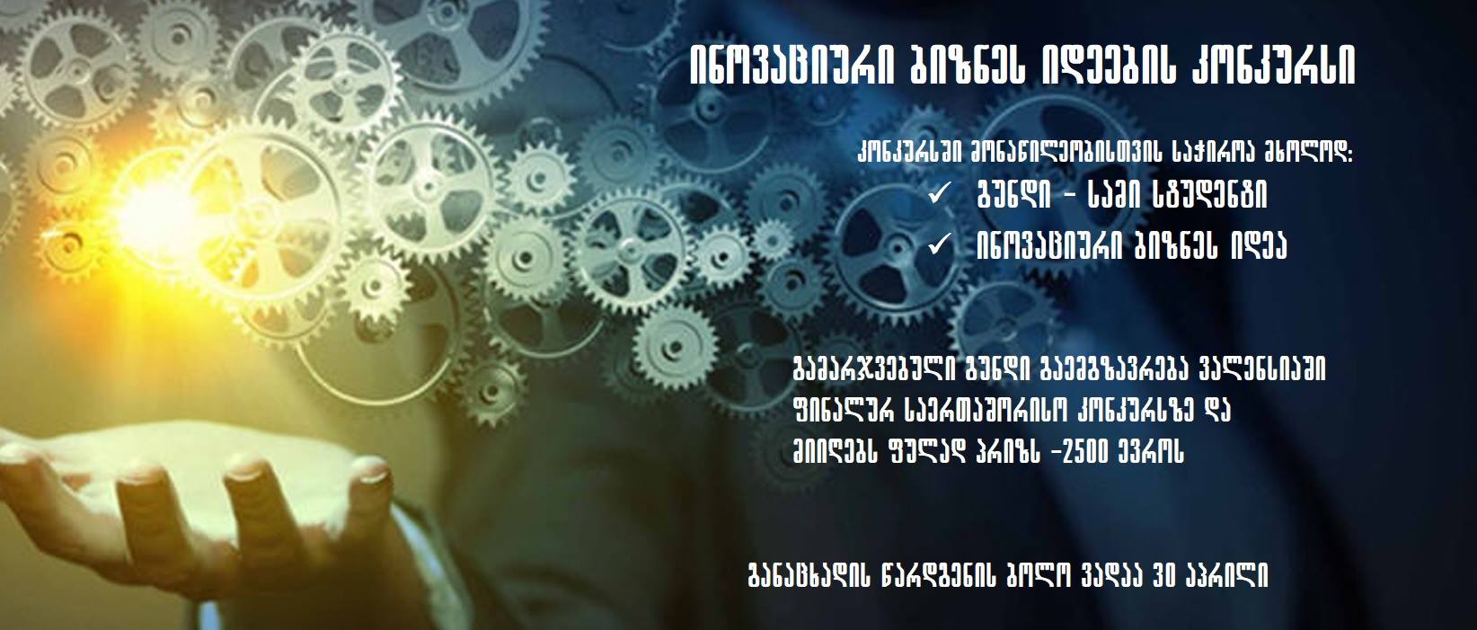ბსუ-ს ინოვაციების ცენტრი ინოვაციური ბიზნეს იდეების კონკურსს აცხადებს. კონკურსისთვის საჭიროა : შეადგინოთ გუნდი სამი სტუდენტისაგან მოიფიქროთ ინოვაციური ბიზნეს იდეა შეავსოთ განაცხადი და გადაუგზავნოთ შესაბამის საკონტაქტო პირს (gizopartskh@gmail.com) განაცხადის ფორმა შეგიძლიათ ჩამოტვირთოთ ვებგვერდიდან - https://innocens.webs.upv.es