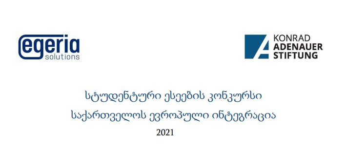 ა(ა)იპ „ეგერია სოლუშენსი“, კონრად ადენაუერის ფონდის მხარდაჭერით, აცხადებს ესეების კონკურსს უმაღლესი სასწავლებლების ბაკალავრიატის საგანმანათლებლო პროგრამის სტუდენტებისთვის თემაზე - საქართველოს ევროპული ინტეგრაცია.