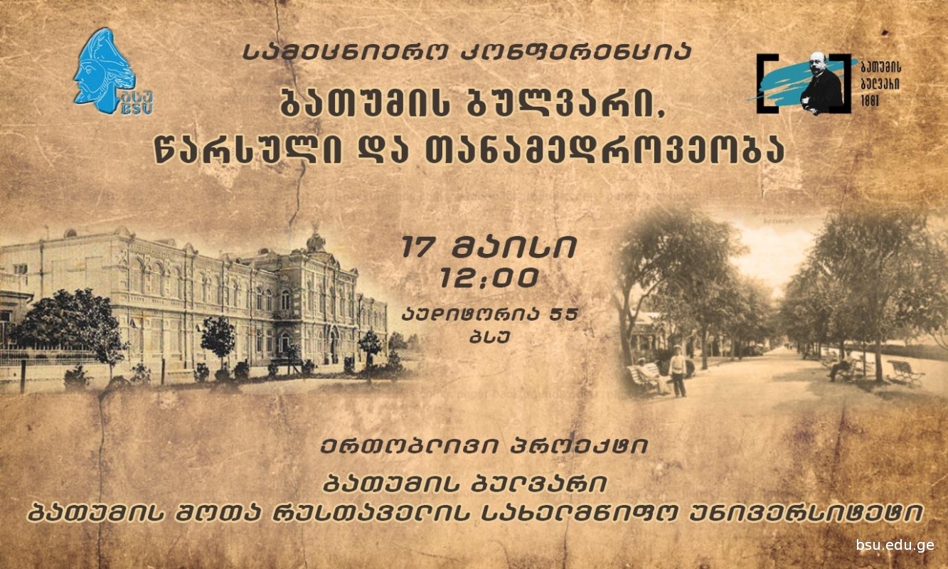 17 მაისს, 12:00 საათზე, ბათუმის შოთა რუსთაველის სახელმწიფო უნივერსიტეტში, 55-ე აუდიტორიაში გაიმართება სამეცნიერო კონფერენცია „ბათუმის ბულვარი - წარსული და თანამედროვეობა“. ბათუმის სახელმწიფო უნივერსიტეტისა და ბათუმის ბულვარის თანამშრომლობის ფარგლებში დაგეგმილ სამეცნიერო სესიაში მონაწილეობის მიღება შეეძლებათ ბულვარის თემატიკით დაინტერესებულ პირებს.