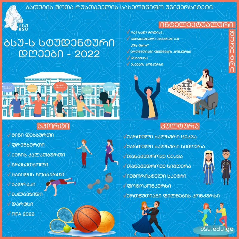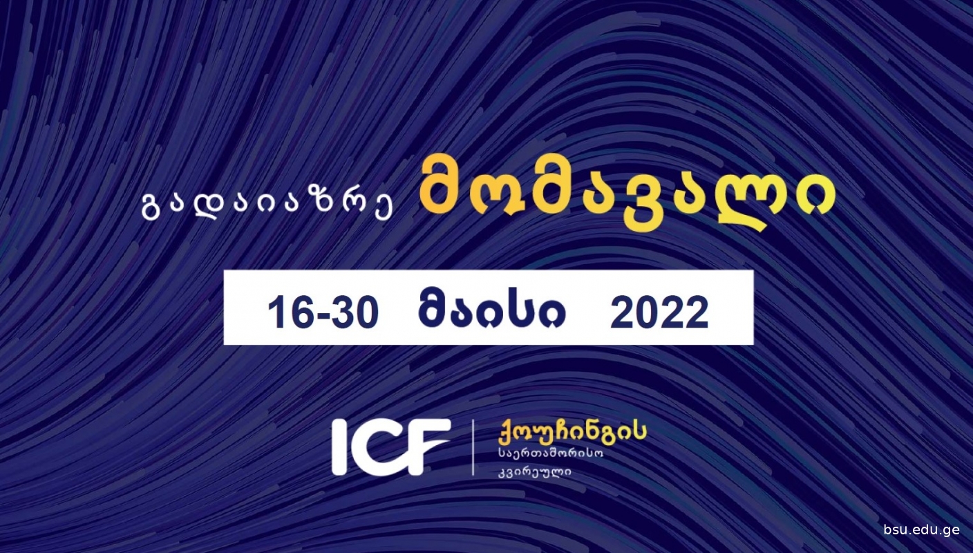 30 მაისს, 12:00 საათზე, ბსუ-ს რუსთაველის დარბაზში (N55 აუდიტორია) ICF-ის საქართველოს სერტიფიცირებული ქოუჩები:გვანცა ბარაბაძე, მარიკა ხალიანი, ნინო ეფხოშვილი, ლალი ბადრიძე, ეკატერინე ბაბუნაშვილი, გვანცა ბარაბაძე, ირმა გურამიშვილი, ეთერ მაზანაშვილი გამართავენ ტრეინინგს თემაზე: „გადაიაზრე მომავალი.“ ტრენინგი ქოუჩინგის საერთაშორისო კვირეულის ფარგლებში იმართება და მისი მიზანია ადამიანების, ორგანიზაციების გაძლიერება და ახალი რეალობისთვის საჭირო სტრატეგიული ინსტრუმენტების მიწოდება.