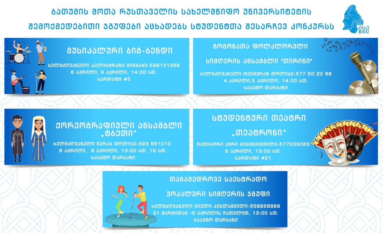 ჩვენება გაიმართება I კორპუსში, III სართულზე, № 55 აუდიტორიაში. (შემოსასვლელი ბულვარიდან)