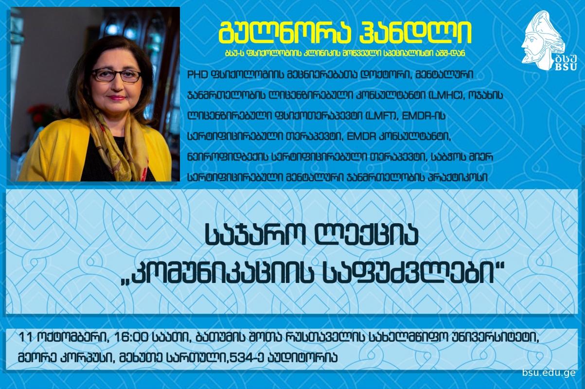 11 ოქტომბერს, 16:00 საათზე, ბათუმის შოთა რუსთაველის სახელმწიფო უნივერსიტეტში (534-ე აუდიტორია), ამერიკელი დოქტორი, ლიცენზირებული ფსიქიატრიული ჯანმრთელობის მრჩეველი (LMHC), ლიცენზირებული ოჯახის თერაპევტი (LMFT), EMDR სერტიფიცირებული თერაპევტი, EMDR კონსულტანტი ტრენინგში, ნეიროფიდბეკის სერთიფიცირებული თერაპევტი გულნორა ჰანდლი, საჯარო ლექციას ჩაატარებს თემაზე: „კომუნიკაციის საფუძვლები“. დოქტორი გულნარა ჰადლი ლექციაზე კომუნიკაციის ისეთ აქტუალურ საკითხებს წარმოადგენს, როგორიცაა: აზრის მკაფიოდ გამოთქმა, ინფორმაციის გადაცემა და მიღება, არგუმენტის ჩამოყალიბება, დისკუსია და კრიტიკული აზროვნება.