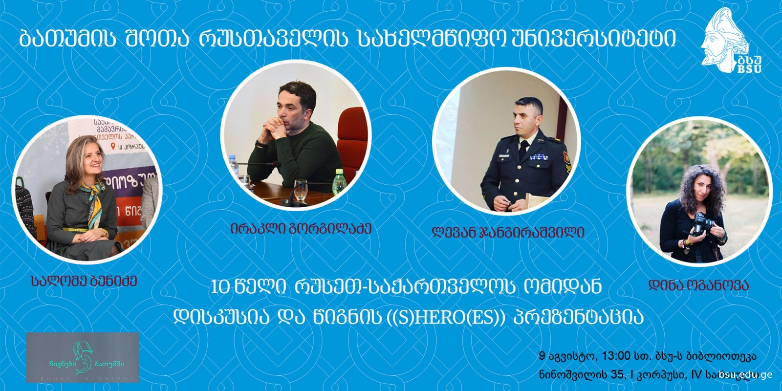 9 აგვისტოს, 13:00 საათზე, ბსუ-ს ბიბლიოთეკაში, ბათუმის შოთა რუსთაველის სახელმწიფო უნივერსიტეტი, გამომცემლობასთან ერთად „წიგნები ბათუმში“ რუსეთ-საქართველოს ომის 10 წლისთავთან დაკავშირებით ატარებს დისკუსიას და წიგნის “(S)hero(es)” პრეზენტაციას.