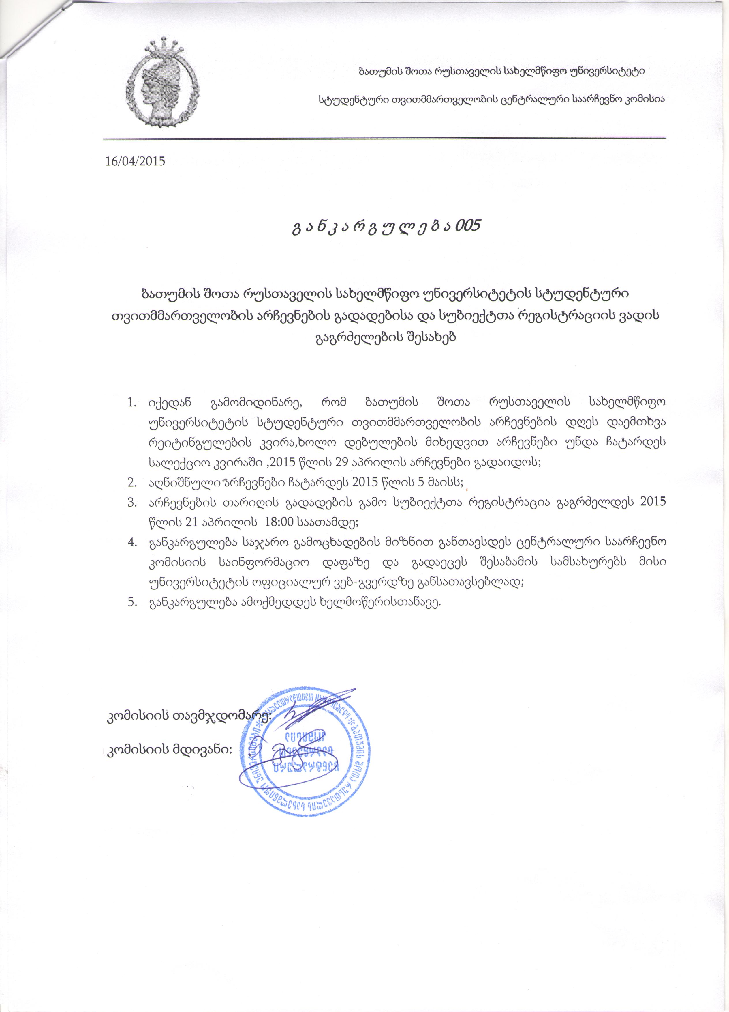 განკარგულება 005 (სტუდენტური თვითმმართველობის არჩევნების გადადებისა და სუბიექტთა რეგისტრაციის ვადის გაგრძელების შესახებ)