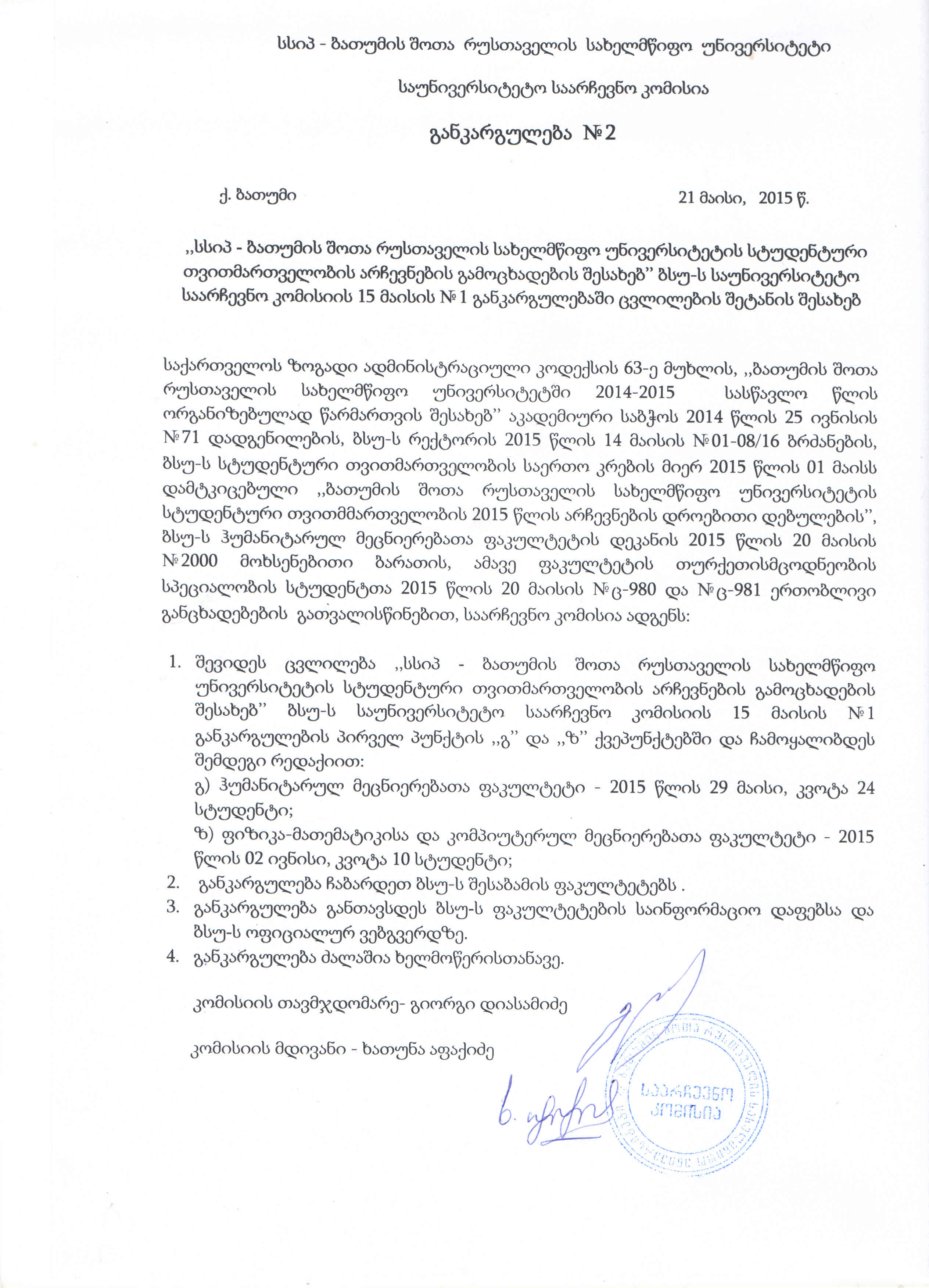,,სსიპ - ბათუმის შოთა რუსთაველის სახელმწიფო უნივერსიტეტის სტუდენტური თვითმართველობის არჩევნები 2015 წლის 28-29 მაისს და 1-2 ივნისს ჩატარდება ძირითადი კორპუსის პირველ სართულზე (მის: ქ. ბათუმი, ნინოშვილის ქ#35,) მე-15 აუდიტორიაში, ხოლო 3 ივნისს ტექნოლოგიური ფაკულტეტის კორპუსში (მის: ქ. ბათუმი ფიროსმანის ქ#12) 104-ე აუდიტორიაში 09.00 საათიდან 17.00 საათამდე