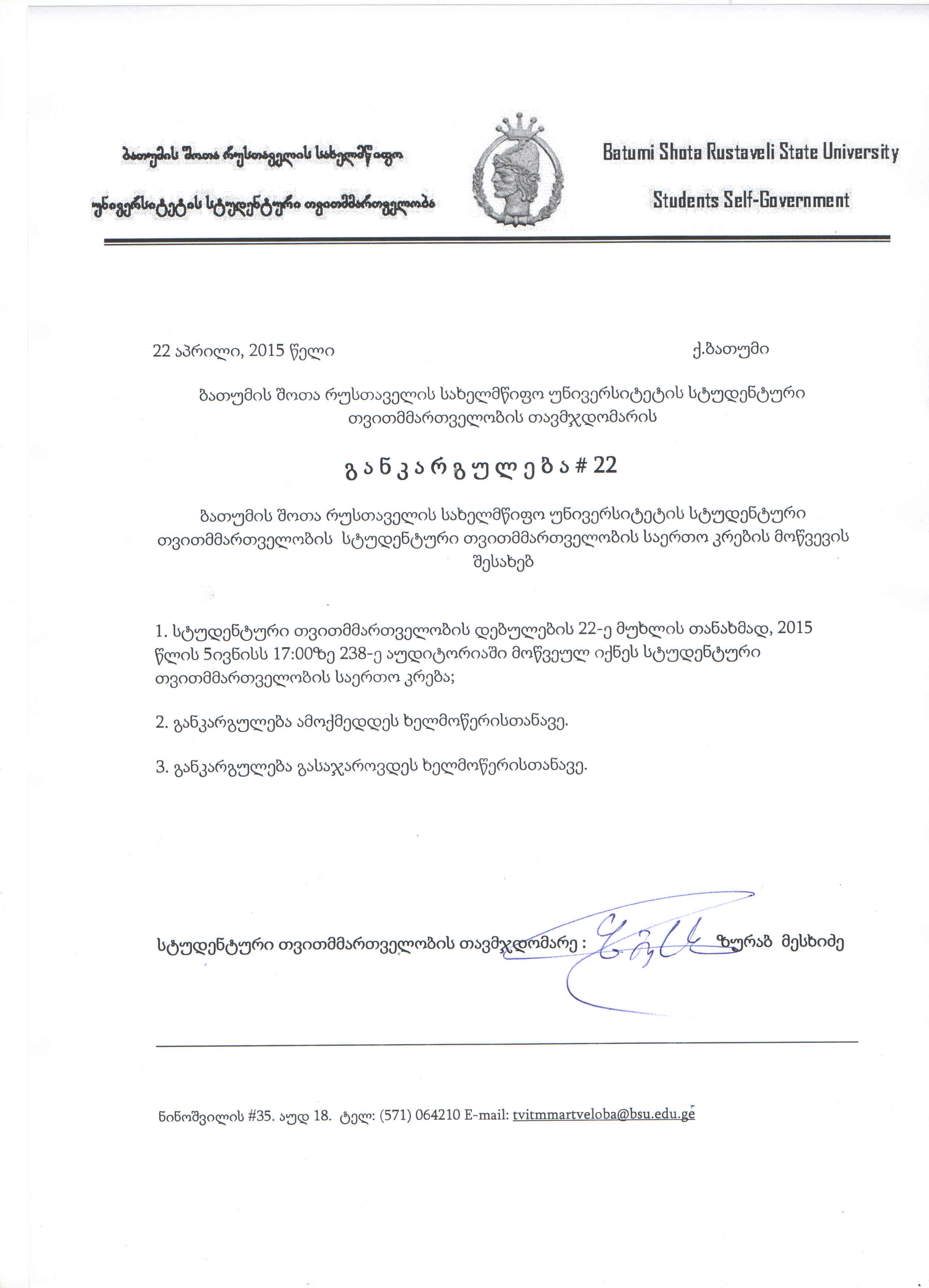 2015 წლის 5 ივნისს, 17:00 საათზე 238-ე აუდიტორიაში გაიმართება სტუდენტური თვითმმართველობის საერთო კრება