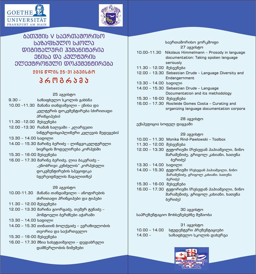 ბათუმის შოთა რუსთაველის სახელმწიფო უნივერსიტეტი ფრანკფურტის იოჰან ვოლფგანგ გოეთეს უნივერსიტეტთან თანამშრომლობითა და აჭარის განათლების, კულტურისა და სპორტის სამინისტროს დაფინანსებით 25-31 აგვისტოს ატარებს საერთაშორისო საზაფხულო სკოლას: „დიგიტალური ჰუმანიტარია - ენისა და კულტურის ელექტრონული დოკუმენტაცია“ (ხელმძღვანელები: პროფ. მ. თანდაშვილი – ფრანკფურტის უნივერსიტეტი, პროფ. რ. ხალვაში – ბსუ).