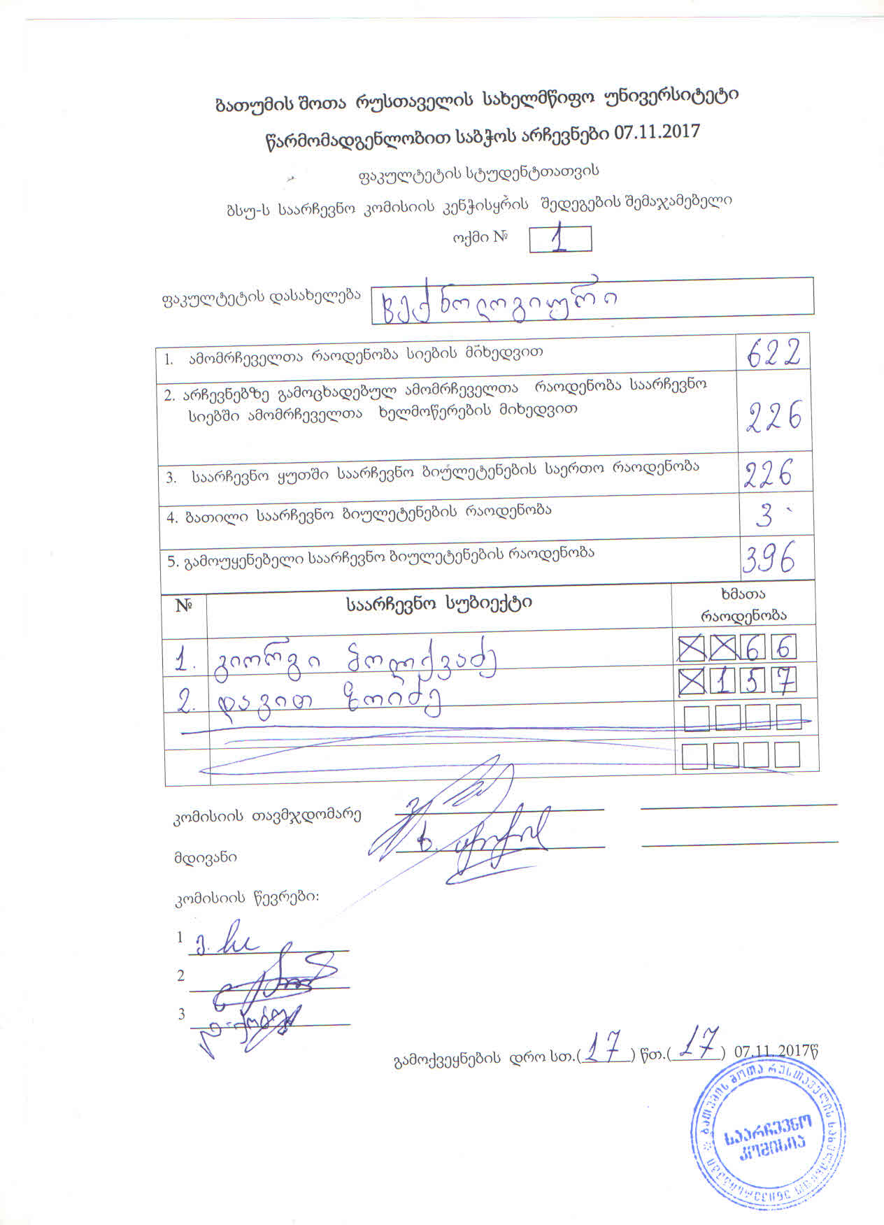 ბსუ-ს საარჩევნო კომისიის კენჭისყრის შედეგების შემაჯამაბელი ოქმი N-1