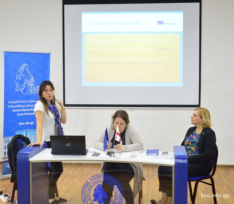 ბათუმის შოთა რუსთაველის სახელმწიფო უნივერსიტეტში ბაკალავრიატის, მაგისტრატურის და დოქტორანტურის სტუდენტებისათვის საინფორმაციო შეხვედრა გაიმართა ERASMUS+ის გაცვლითი პროგრამის შესახებ. ბსუ-ს სტრატეგიული განვითარებისა და საგარეო ურთიერთობათა დეპარტამენტის უფროსის მოადგილემ ნანა ყურშუბაძემ პროგრამაში მონაწილეობის მსურველებს უცხოეთის უმაღლეს საგანმანათლებლო დაწესებულებებში სწავლების პირობები გააცნო და კონკურსში მონაწილეობისათვის საჭირო დოკუმენტაციის, პარტნიორი უნივერსიტეტების, ვადებისა და სტიპენდიების შესახებ მიაწოდა ინფორმაცია.