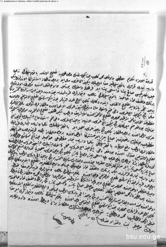 „ბათუმის სანჯაყში გურიელის ქვეყნისადმი დაქვემდებარებული ბათუმის ნაჰიე ადრე დავთრის გარეშე წერილობითი პირობით, წლიური ორმოცდათხუთმეტი ათასით, გონიოს სანჯაყბეგების ხასად იყო აღწერილი, მაგრამ ამ დრომდე გურიელთა კუთვნილებაში და მფლობელობაში იყო; და ვინაიდან გონიოს ბეგებს ისინი არ ეკავათ, ხსენებული ნაჰიე გურიელის ქვეყანას და მის მფლობელობას ჩამოერთვა და შემოისაზღვრა. ამიერიდან უზენაესი ხაზინის მიერ იქნა დაკავებული და მირლივას თანხმობით ახლიდან აღიწერა ხსენებული ნაჰიეს მთლიანი შემოსავლის დადგენის მიზნით და დავთარში იქნა შეტანილი. თოთხმეტი სოფლის უშრის საფასური მთლიანად, თევზის ბაზარი, ტბები და სხვა; ბადჰავა და საპატარძლო გამოსაღები ოთხას ოცდაათ ნახევარი და მეოთხედი ყურუშია. რამდენიმე წლის განმავლობაში, სანამ ეს წესი დამკვიდრდება, მოსახლეობა სხვამხრივ არ შეაწუხოთ. [1]115 წლის მარტის თვიდან მოყოლებული ადრე რაჭველის ციხის დაცვაში მყოფ, ქვემო აჭარის სანჯაყბეგ იუსუფ ბეგსა და მის ძმას მეჰმედს აქვს დაკისრებული. ხსენებულ ნაჰიეში სავარგულების სიმცირის და მოსახლეობის ზედმეტად სიღარიბის გამო, მოსახლეობა თავიდანვე გათავისუფლდეს [ზედმეტი გადასახადებისაგან -ზ.შ.], ბათუმის ნავსადგურთან ახლოს ხელახლა ჩასახლებულების გარდა. ციხის გალავნის ხითა და ქვით გამაგრების სამუშაოები დასრულდეს, აგრეთვე დამთავრდეს სხვა დაზიანებული კედლების აღდგენა. მხოლოდ უშრის დადგენილი საფასური იქნეს გადახდილი და უზენაესი ხაზინის მხრიდან ურჯულოთაგან მათი დამსახურების მიხედვით წელიწადში დადგენილი თითო კეთილშობილი ოქრო ჯიზიეს აკრეფის შემდეგ, საბუთი გაიცეს. ამის გარდა ხსენებულ ნაჰიეში მცხოვრები მუსლიმი და არამუსლიმი მოსახლეობა ავარიზით, ურფისა და შაკკას გადასახადებით და ფირმანით დაკისრებული არცერთი გადასახადით არ იქნას შეწუხებული და შევიწროებული. არ გაიყიდოს ბათუმის ნაჰიეს არცერთი რეაია. თუ გაყიდვა გამოაშკარავდა, მათი ადგილსამყოფელიდან უკან დააბრუნონ და ძველ ადგილებზე დაასახლონ და გამყიდველები დაისაჯონ. თუ ვინმე გურიიდან, იმერეთიდან ან სხვა ადგილებიდან ჩამოვა და ისლამის პატივს ეზიარება, შარიათის მხრიდან ხსენებულ ნაჰიეში თავისუფალი ადგილები აჩვენეთ და დაასახლეთ. ხსენებული პირობებით მთავარ საანგარიშოში ჩაიწეროს და მოსახლეობას ეცნობოს, საპატიო ბრძანება გაიცეს და დავთრის სახე მიეცეს. არზრუმის გამგებელმა უკეთილშობილესმა ჰალილ ფაშამ წარდგინება და საბუთი და თამასუქი გამოაგზავნა მთავარ დავთარხანაში. შემოწმების დროს ბათუმის სანჯაყის მო