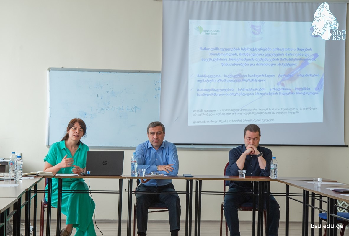პროექტის „მართლმსაჯულების ნავიგატორი“ ფარგლებში, ბსუ-ში მართლმსაჯულების სტრუქტურებისა და ადამიანის უფლებათა დაცვის სფეროში მომუშავე ორგანიზაციების წარმომადგენლების მონაწილეობით თემატური სემინარი გაიმართა. მწვანე სექტორის ხელმძღვანელმა ილია გუჩმანიძემ შეხვედრის მონაწილეებს გააცნო, პროექტის ძირითადი ამოცანები და საქმიანობის მიმართულებები, ბსუ-ს იურიდიული და სოციალურ მეცნიერებათა ფაკულტეტის დეკანმა, პროფესორმა ლევან ჯაყელმა და მწვანე სექტორის პროგრამების მენეჯერმა ციალა ქათამიძემ წარადგინეს მოსწავლეთა საექსკურსიო-საინფორმაციო ტურების ორგანიზების თემატური გზამკვლევის სამუშაო კონცეფცია და საუკეთესო საერთაშორისო გამოცდილებაზე დაყრდნობით, დეტალურად იმსჯელეს მართლმსაჯულების სტრუქტურებში მოსწავლეთა ჯგუფების მიღების, საინფორმაციო-საპრეზენტაციო პროგრამების შედგენისა და საექსკურსიო მენეჯმენტის განვითარების საკითხებზე. სამოქალაქო განათლების ექსპერტმა ლადო აფხაზავამ თავის პრეზენტაციაში ხაზი გაუსვა საგანმანათლებლო პროცესში სასწავლო ტურების განხორციელების როლსა და მნიშვნელობას.